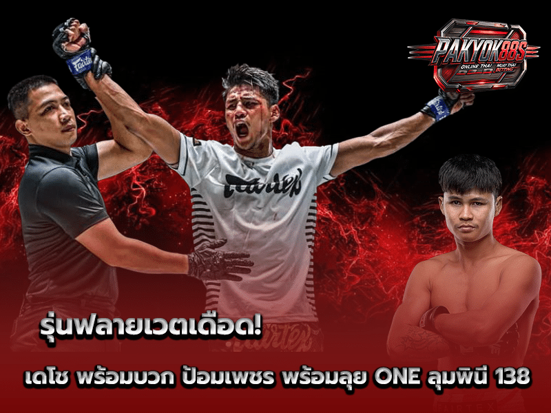เดโช ป.บริรักษ์ นักชกหนุ่มวัย 23 ปี เตรียมระเบิดความมันส์เต็มพิกัด พบคู่เอกคู่บู๊ตัวพ่อ ป้อมเพชร ป๋องสุพรรณ พีเค. นักชกหมัดหนักวัย 27 ปี จากบุรีรัมย์ ในกติกามวยไทย รุ่นฟลายเวต (125-135 ปอนด์) ศึก ONE ลุมพินี 138